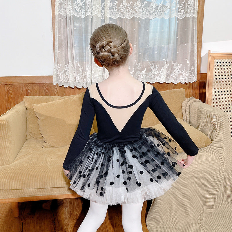 Black Dots Girls Training Skirt Children's Dance Clothes Grading Split Ballet Dress Kids Leotard For Gymnastics Long Sleeve Soft