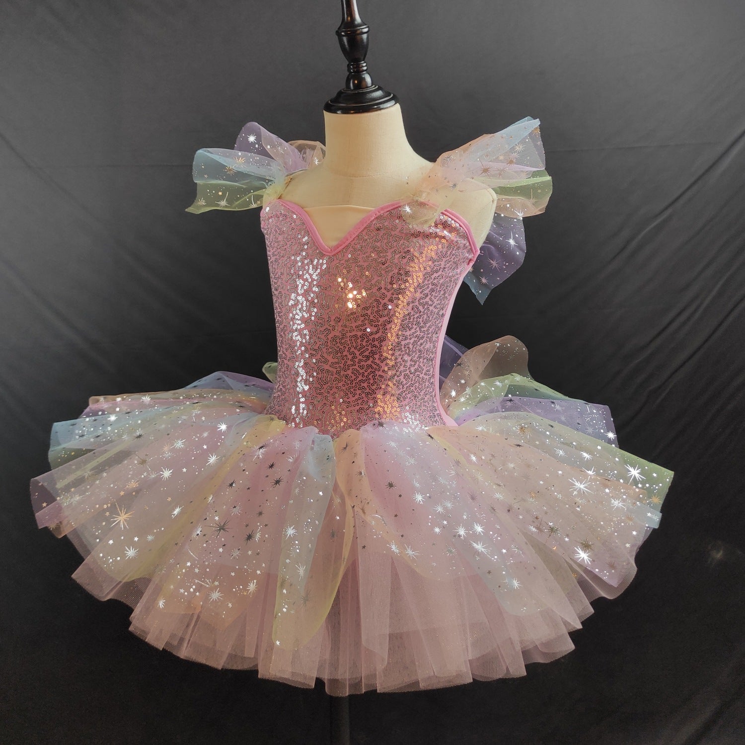 Girls' ballet dress with straps chiffon dress children's puff-sleeved dress performance outfit little swan princess dress